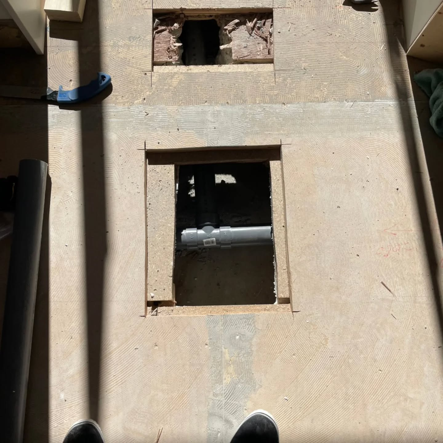 昨日開口した箇所から給水管・給湯管を目的の設置場所まで延長し、配管作業を実施。